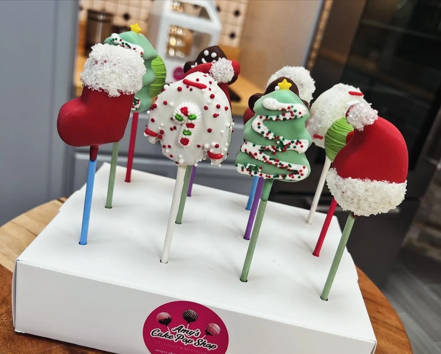 Holiday Cake Pops come in festive shapes with listed flavors. No substitutions online, but additional flavors are available in-store for gifting or treats.
